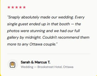 Premium photo booth activations for weddings, corporate events, galas, parties, and brand campaigns in Ottawa & Surrounding areas. High-end gear. Custom branding. Memories that last.